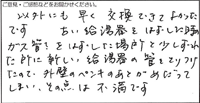 2023.04.02 お客様の声 神戸市匿名様 以外にも早く交換できてよかったです。 古い給湯器をはずした時のガス管?をはずした場所と少しずれた所に新しい給湯器の管をとりつけたので、外壁のペンキのあとがめだってしまい、その点は不満です。