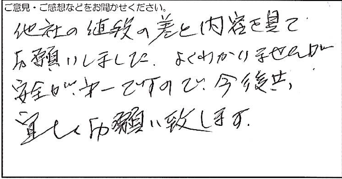 他社の値段の差と内容を見てお願いしました。 よくわかりませんが、安全が第一ですので、今後共宜しくお願い致します。