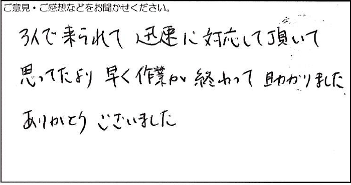 3人で来られて迅速に対応して頂いて思ったより早く作業が終わって助かりました。 ありがとうございました。