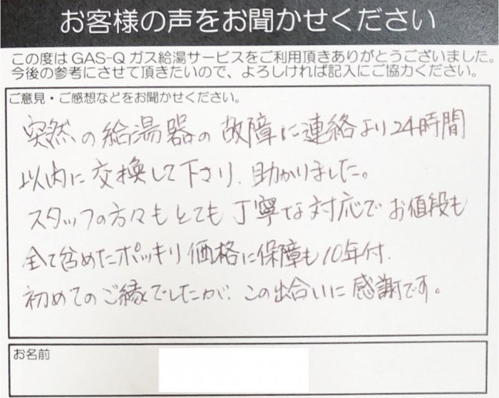 2021.01.21 お客様の声 神戸市灘区 匿名 この度は弊社に交換工事をお任せいただき 誠にありがとうございました。 突然の故障、とても驚かれことと思います、 弊社は最短当日にお伺いすることが可能ですので お客様のご都合次第すぐに駆け付けます。 こちらこそ、お客様とのご縁に感謝いたしております お褒めの言葉、本当にありがとうございます。 また何かお困りのことがありましたら ご連絡ください。 貴重なお時間ご意見ありがとうございました。