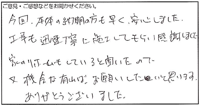 2023.05.13 お客様の声 大阪市匿名様 今回、本体の納期の方も早く、安心しました。 工事も迅速丁寧に施工してもらい感謝しました。 家のリフォームもしていると聞いたので 又機会が有れば、お願いしたいと思います。 ありがとうございました。