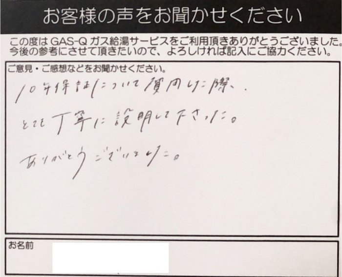 2020.12.29 お客様の声 神戸市垂水区 匿名 この度は弊社に交換工事をお任せいただき 誠にありがとうございました。 10年保障について、ご理解いただきありがとうございます その後、お困りのことはございませんでしょうか。 質問や、相談がございましたら 電話、メール、ラインにてお気軽にご連絡ください。 貴重なお時間ご意見ありがとうございました。