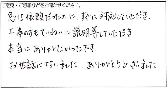 2023.05.13 お客様の声 明石市匿名様 急な依頼だったのに、すぐに対応していただき、 工事の方もていねいに説明等していただき 本当にありがたかったです。 お世話になりました。ありがとうございました。