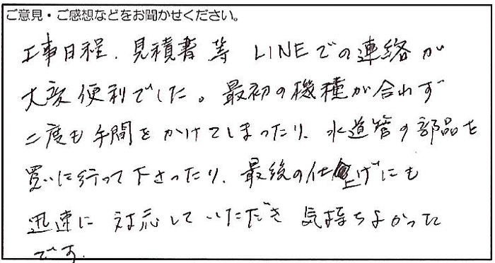 2023.05.13 お客様の声 枚方市匿名様 工事日程、見積書等LINEでの連絡が 大変便利でした。最初の機種が合わず 二度も手間をかけてしまったり、水道管の部品を 買いに行って下さったり、最後の仕上げにも 迅速に対応していただき気持ちよかったです。