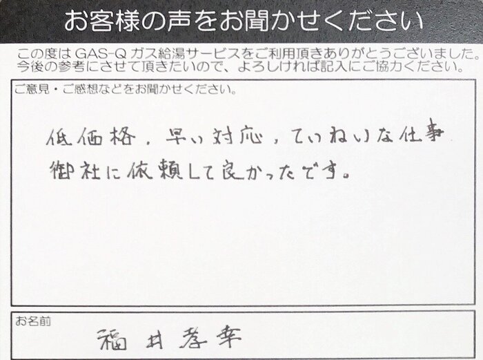 2021.01.15 お客様の声 神戸市長田区 福井様 福井様、この度は弊社に交換工事をお任せいただき 誠にありがとうございました。 福井様にお喜びいただけて従業員一同 とても嬉しく思います。 今後とも、よろしくお願いいたします。 また、お困りのことがございましたら 弊社にてご連絡くださいませ。 貴重なお時間ご意見ありがとうございました。