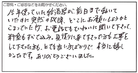 2023.08.01 お客様の声 西宮市 中村様 15年使っていた給湯器が、前日まで動いて いたのに突然の故障。どこにお願いしようかと こまっていた所、お電話でもていねいに聞いて下さって、 料金もすべて込み。見積りに来て下さった方も、工事を して下さった方も、とても良い方ばかりで、本当に嬉し かったです。ありがとうございました。 お客様へ 心温まるお言葉をいただき、大変うれしい限りです。 お客様からいただいたお言葉は、全社員の励みになります。 これからもご満足いただける商品をご提供できるよう努めてまいります。