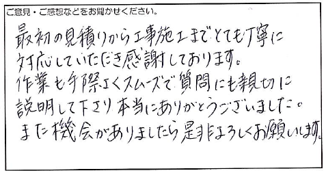 2023.08.01 お客様の声 加古川市 匿名様 最初の見積りから工事施工までとても丁寧に 対応していただき感謝しております。 作業も手際よくスムーズで質問にも親切に 説明して下さり本当にありがとうございました。 また機会がありましたら是非よろしくお願いします。 お客様へ この度は、弊社にご依頼いただき、誠にありがとうございます。 当社の施工、対応にご満足いただけましたようで 担当共々、大変嬉しく思います。 またご検討の設備がございましたらお気軽ご連絡ください。