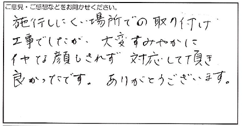 2023.08.01 お客様の声 芦屋市 匿名様 施工しにくい場所での取り付け 工事でしたが、大変すみやかに イヤな顔もされず対応して頂き 良かったです。ありがとうございます。 お客様へ この度は、弊社にご依頼いただき、誠にありがとうございます。 お客様からのご感想をいただけて、私たちもとても嬉しく思います。 今後もお客様に満足いただけるよう、一層努力してまいります。