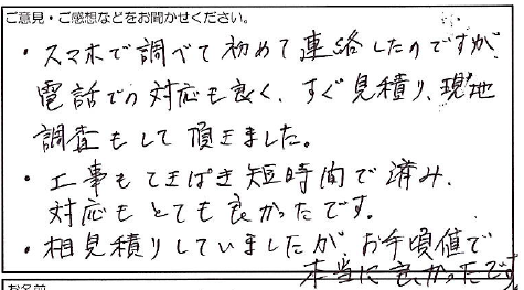 2023.08.03 お客様の声 吹田市 匿名様 ・スマホで調べて初めて連絡したのですが 電話での対応も良く、すぐ見積もり、現地 調査もして頂きました。 ・工事もてきぱき短時間で済み、 対応もとても良かったです。 ・相見積もりしていましたが、お手頃値で 本当に良かったです。 お客様へ この度は、弊社にご依頼いただき、誠にありがとうございます。 嬉しいお言葉をいただき、大変恐縮でございます。 今後も、よりよいサービスをお届けできるよう努めてまいります。