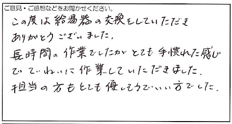 2023.08.03 お客様の声 尼崎市 匿名様 この度は給湯器の交換をしていただき ありがとうございました。 長時間の作業でしたがとても手慣れた感じ でていねいに作業していただきました。 担当の方もとても優しそうでいい方でした。 お客様へ この度は弊社にご依頼いただき、誠にありがとうございます。 当社の施工、対応にご満足いただけましたようで 担当共々、大変嬉しく思います。 今後とも、何卒よろしくお願いいたします。