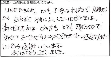 2023.08.03 お客様の声 神戸市 土居様 LINEで始まり、とても丁寧な対応で、見積もり から交換まで、本当によくしていただきました。 来てくださった方はどの方もとても感じがよくて 安心してお任せすることができました。迅速な対応 に心から感謝いたします。 ありがとうございました。 お客様へ この度は弊社にご依頼いただき、誠にありがとうございます。 当社の施工、対応にご満足いただけましたようで 大変うれしい限りです。 これからもご満足いただける商品をご提供できるよう努めてまいります。