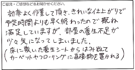 2023.08.03 お客様の声 加古川市 匿名様 効率よく作業して頂き、きれいな仕上がりで 予定時間よりも早く終わったので概ね 満足していますが、部屋の養生不足が 少々気になってしまいました。 (床に敷いた養生シートからはみ出してカーペットやフローリングに直接物を置かれる) お客様へ この度は弊社にご依頼いただき、誠にありがとうございます。 また、ご不満をおかけしてしまい、大変申し訳ございませんでした。 ご指摘いただいた点を真摯に受け止め今後改善に努めてまいります。