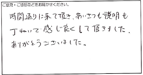 2023.08.05 お客様の声 明石市 匿名様 時間通りに来て頂き、あいさつも説明も 丁ねいで感じ良くして頂きました。 ありがとうございました。 お客様へ この度は弊社にご依頼いただき、誠にありがとうございます。 お客様からのご感想をいただけて、私たちもとても嬉しく思います。 今後もお客様に満足いただけるよう、一層努力してまいります。