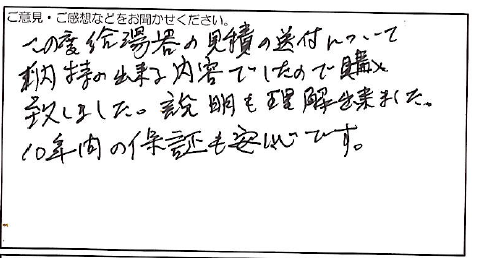 2023.08.05 お客様の声 神戸市 匿名様 この度給湯器の見積の送付について 納得の出来る内容でしたので購入 致しました。説明も理解出来ました。 10年間の保証も安心です。 お客様へ この度は弊社にご依頼いただき、誠にありがとうございます。 ご満足いただけたようで、とても嬉しく思います。 今後もお客様にご満足いただけるよう、一層努力してまいります。