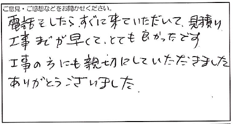 2023.08.05 お客様の声 西宮市 匿名様 電話をしたら、すぐに来ていただいて、見積り、 工事までが早くて、とても良かったです。 工事の方にも親切にしていただきました。 ありがとうございました。 お客様へ この度は弊社にご依頼いただき、誠にありがとうございます。 当社の施工、対応にご満足いただけましたようで 大変嬉しく思います。 今後とも、何卒よろしくお願いいたします。
