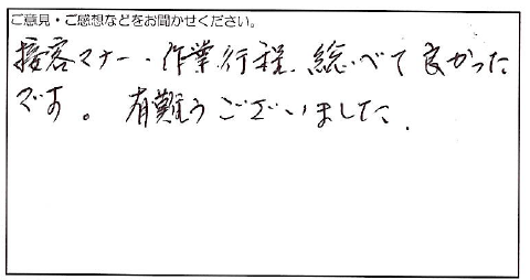2023.08.05 お客様の声 高槻市 非公開様 接客マナー、作業工程、総べて良かった です。有難うございました。 お客様へ この度は弊社にご依頼いただき、誠にありがとうございます。 ご満足いただけたようで、とても嬉しく思います。 お客様からのご感想は、私たちにとって大変励みとなります。