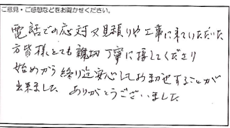 2023.08.08 お客様の声 宝塚市 匿名様 電話での応対又見積りや工事に来ていただいた 方皆様とても親切丁寧に接してくださり 始めから終わり迄安心しておまかせすることが 出来ました。ありがとうございました。 お客様へ この度は弊社にご依頼いただき、誠にありがとうございます。 嬉しいお言葉をいただき、大変恐縮でございます。 これからもご満足いただけるサービスをご提供できるよう努めてまいります。