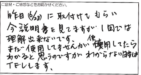 2023.08.09 お客様の声 神戸市 非公開様 昨日(6/28)に取付けてもらい 今説明書を見てますが1回では 理解出来ないです。 まだ使用してませんが使用してたら わかると思うのですがわからない時は TELします。 お客様へ この度は弊社にご依頼いただき、誠にありがとうございます。 商品に関するご質問がありましたら、 いつでもお気軽にお問い合わせくださいませ。