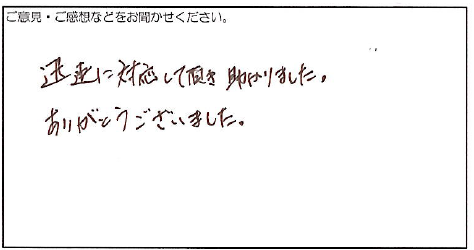 2023.08.10 お客様の声 神戸市 匿名様 迅速に対応して頂き助かりました。 ありがとうございました。 お客様へ この度は弊社にご依頼いただき、誠にありがとうございます。 弊社の施工、対応にご満足いただけましたようで 大変嬉しく思います。 今後もお客様に満足いただけるよう、一層努力してまいります。