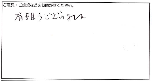 2023.08.14 お客様の声 尼崎市 匿名様 有難うございました。 お客様へ この度は弊社にご依頼いただき、誠にありがとうございます。 嬉しいお言葉をいただき、大変恐縮でございます。 今後も、よりよいサービスを お届けできるよう努めてまいります。