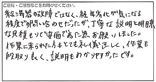 2023.08.14 お客様の声 尼崎市 匿名様 給湯器の故障ではなく、経年劣化が気になる 程度での問い合わせだったが、丁寧な説明と明瞭 な見積もりで安価であった為お願いしました。 作業に来られた方もとても礼儀正しく、作業も 段取り良く、説明もわかりやすかったです。 お客様へ この度は弊社にご依頼いただき、誠にありがとうございます。 弊社の施工、対応にご満足いただけましたようで 大変嬉しく思います。 これからもご満足いただけるサービスを ご提供できるよう努めてまいります。