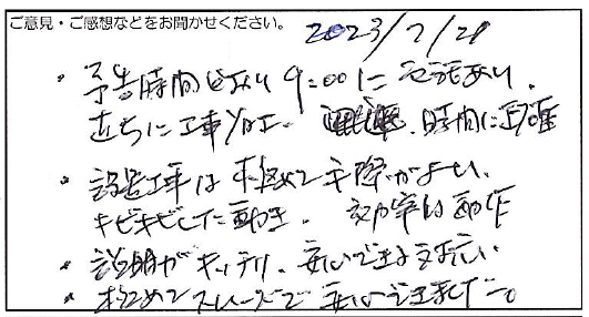 2023.08.14 お客様の声 大阪市 匿名様 ・予告時間どおり9:00に電話あり 直ちに工事施工。時間に正確。 ・設置工事は極めて手際がよい。 キビキビした動き。効率的動作。 ・説明がキッチリ。安心できる対応。 ・極めてスムーズで安心できました。 お客様へ この度は弊社にご依頼いただき、誠にありがとうございます。 嬉しいお言葉をいただき、大変恐縮でございます。 これからもご満足いただけるサービスを ご提供できるよう努めてまいります。