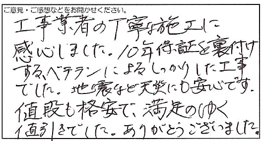 2023.08.14 お客様の声 相模原市 匿名様 工事業者の丁寧な施工に 感心しました。10年保証を裏付け するベテランによるしっかりした工事 でした。地震など天災にも安心です。 値段も格安で、満足のゆく 値引きでした。ありがとうございました。 お客様へ この度は弊社にご依頼いただき、誠にありがとうございます。 嬉しいお言葉をいただき、大変恐縮でございます。 今後も、よりよいサービスを お届けできるよう努めてまいります。