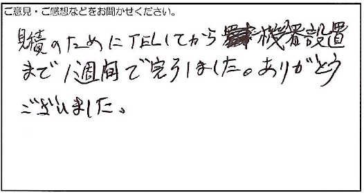 2023.08.14 お客様の声 堺市 匿名様 見積のためにTELしてから機器設置 まで1週間で完了しました。ありがとう ございました。 お客様へ この度は弊社にご依頼いただき、誠にありがとうございます。 お客様からのご感想をいただけて、 私たちもとても嬉しく思います。 今後もお客様に満足いただけるよう 一層努力してまいります。