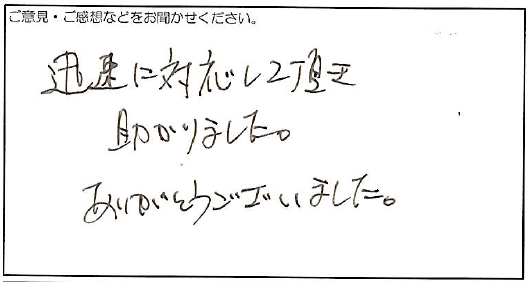 2023.08.17 お客様の声 宝塚市 チラシ様 迅速に対応して頂き 助かりました。 ありがとうございました。 お客様へ この度は弊社にご依頼いただき、誠にありがとうございます。 ご満足いただけたようで、とても嬉しく思います。 今後も、よりよいサービスを お届けできるよう努めてまいります。