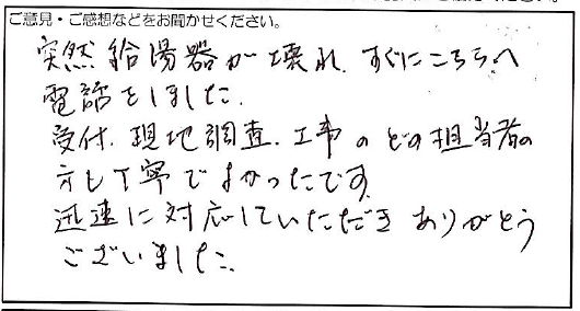 2023.08.18 お客様の声 明石市 匿名様 突然給湯器が壊れ、すぐにこちらへ 電話をしました。 受付、現地調査、工事のどの担当者の 方も丁寧でよかったです。 迅速に対応していただきありがとう ございました。 お客様へ この度は弊社にご依頼いただき、誠にありがとうございます。 心温まるお言葉をいただき、大変うれしい限りです。 お客様からいただいたお言葉は、 担当共々、全社員の励みになります。 今後とも、何卒よろしくお願いいたします。