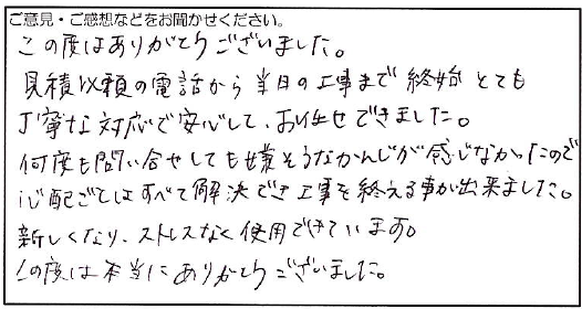 2023.08.18 お客様の声 西宮市 匿名様 この度はありがとうございました。 見積依頼の電話から当日の工事まで終始とても 丁寧な対応で安心して、お任せできました。 何度も問い合せしても嫌そうなかんじが感じなかったので 心配ごとはすべて解決でき工事を終える事が出来ました。 新しくなり、ストレスなく使用できています。 この度は本当にありがとうございました。 お客様へ この度は弊社にご依頼いただき、誠にありがとうございます。 嬉しいお言葉をいただき、大変恐縮でございます。 お客様からのご評価は、私たちにとって大変励みとなります。 今後もお客様にご満足いただけるよう、一層努力してまいります。