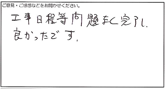 2023.08.18 お客様の声 目黒区 匿名様 工事日程等問題なく完了し 良かったです。 お客様へ この度は弊社にご依頼いただき、誠にありがとうございます。 お客様からのご感想をいただけて、私たちもとても嬉しく思います。 今後もお客様に満足いただけるよう一層努力してまいります。