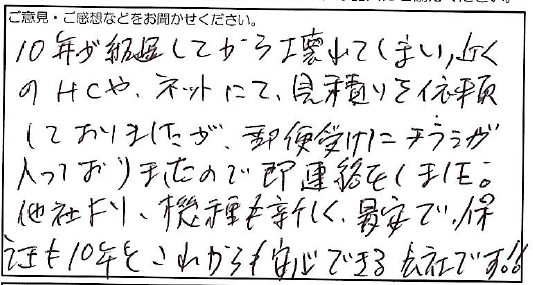 2023.08.19 お客様の声 神戸市 MNS様 10年が経過してから壊れてしまい、近く のHCやネットにて、見積りを依頼 しておりましたが、郵便受けにチラシが 入っておりましたので即連絡をしました。 他社より、機種も新しく、最安で、 保証も10年とこれからも安心できる会社です‼ お客様へ この度は弊社にご依頼いただき、誠にありがとうございます。 お客様からのご感想をいただけて、私たちもとても嬉しく思います。 今後もお客様に満足いただけるよう 一層努力してまいります。