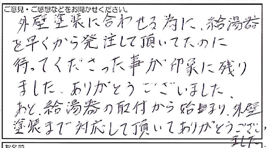 2023.08.19 お客様の声 守口市 匿名様 外壁塗装に合わせる為に、給湯器 を早くから発注して頂いてたのに 待ってくださった事が印象に残り ました。ありがとうございました。 あと、給湯器の取付から始まり、外壁 塗装まで対応して頂いてありがとうございました。 お客様へ この度は弊社にご依頼いただき、誠にありがとうございます。 ご満足いただけたようで、とても嬉しく思います。 お客様からのご評価は、私たちにとって大変励みとなります。 今後もお客様にご満足いただけるよう、一層努力してまいります。