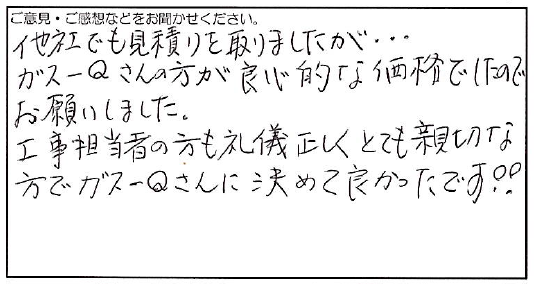 2023.08.19 お客様の声 箕面市 K子様 他社でも見積りを取りましたが・・・ ガスQさんの方が良心的な価格でしたので お願いしました。 工事担当者の方も礼儀正しくとても親切な 方でガスQさんに決めて良かったです‼ お客様へ この度は弊社にご依頼いただき、誠にありがとうございます。 心温まるお言葉をいただき、大変うれしい限りです。 お客様からいただいたお言葉は、 全社員の励みになります。 今後とも、何卒よろしくお願いいたします。