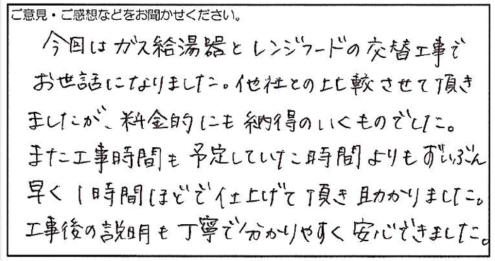 2023.11.10 お客様の声 加古川市 匿名様 今回はガス給湯器とレンジフードの交替工事で お世話になりました。他社との比較させて頂き ましたが、料金的にも納得のいくものでした。 また工事時間も予定していた時間よりもずいぶん 早く1時間ほどで仕上げて頂き助かりました。 工事後の説明も丁寧で分かりやすく安心できました。 お客様へ この度は弊社にご依頼いただき、誠にありがとうございます。 嬉しいお言葉をいただき、大変恐縮でございます。 今後も、よりよいサービスを お届けできるよう努めてまいります。