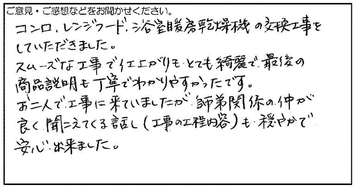 2023.11.10 お客様の声 横浜市 匿名様 コンロ、レンジフード、浴室暖房乾燥機の交換工事を していただきました。 スムーズな工事で仕上がりもとても綺麗で、最後の 商品説明も丁寧でわかりやすかったです。 お二人で、工事に来ていましたが、師弟関係の仲が 良く、聞こえてくる話し(工事の工程内容)も、穏やかで 安心出来ました。 お客様へ この度は弊社にご依頼いただき、誠にありがとうございます。 弊社の施工、対応にご満足いただけましたようで 担当共々、大変嬉しく思います。 今後もお客様に満足いただけるよう 一層努力してまいります。