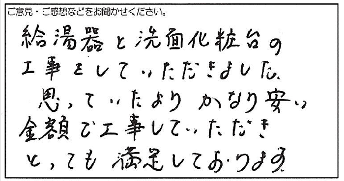 2023.11.10 お客様の声 神戸市 匿名様 給湯器と洗面化粧台の 工事をしていただきました。 思っていたよりかなり安い 金額で工事していただき とっても満足しております。 お客様へ この度は弊社にご依頼いただき、誠にありがとうございます。 お客様からのご感想をいただけて、 私たちもとても嬉しく思います。 これからもご満足いただけるサービスを ご提供できるよう努めてまいります。