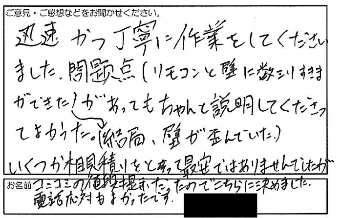 2023.11.10 お客様の声 茨木市 匿名様 迅速かつ丁寧に作業をしてください ました。問題点(リモコンと壁に数ミリすきまができた 結局壁が歪んでた)があってもちゃんと説明してくださっ てよかった。 いくつか相見積りをとって最安ではありませんでしたが コミコミの値段提示だったのでこちらに決めました。 電話応対もよかったです。 お客様へ この度は弊社にご依頼いただき、誠にありがとうございます。 弊社の施工、対応にご満足いただけましたようで 担当共々、大変嬉しく思います。 今後とも、何卒よろしくお願いいたします。