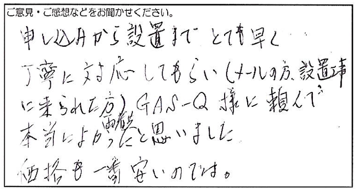 2023.11.11 お客様の声 神戸市 匿名様 申し込みから設置までとても早く 丁寧に対応してもらい(メールの方、設置工事 に来られた方両者共)GAS-Q様に頼んで 本当によかったと思いました。 価格も一番安いのでは。 お客様へ この度は弊社にご依頼いただき、誠にありがとうございます。 弊社の施工、対応にご満足いただけましたようで 担当共々、大変嬉しく思います。 今後とも、何卒よろしくお願いいたします。