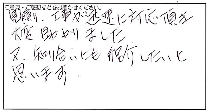 2024.01.19 お客様の声 神戸市 匿名様 見積り、工事が迅速に対応頂き 大変助かりました。 又、知り合いにも紹介したいと 思います。 お客様へ この度は弊社にご依頼いただき、誠にありがとうございます。 嬉しいお言葉をいただき、大変恐縮でございます。 ご紹介割引という制度もございますので、今後ともよろしくお願いいたします。