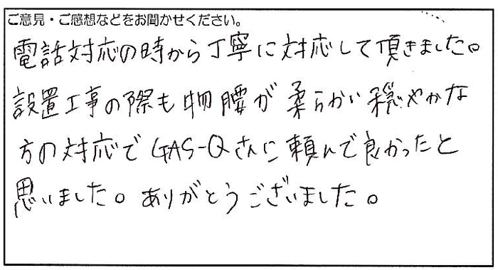 2024.01.19 お客様の声 寝屋川市 匿名様 電話対応の時から丁寧に対応して頂きました。 設置工事の際も物腰が柔らかい穏やかな 方の対応でGAS-Qさんに頼んで良かったと 思いました。ありがとうございました。 お客様へ この度は弊社にご依頼いただき、誠にありがとうございます。 弊社の施工、対応にご満足いただけましたようで 担当共々、大変嬉しく思います。 これからもご満足いただけるサービスを ご提供できるよう努めてまいります。
