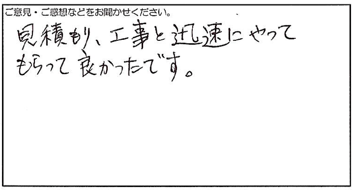 2024.01.19 お客様の声 神戸市 匿名様 見積もり、工事と迅速にやって もらって良かったです。 お客様へ この度は弊社にご依頼いただき、誠にありがとうございます。 弊社の施工、対応にご満足いただけましたようで 大変嬉しく思います。 今後もお客様にご満足いただけるよう、一層努力してまいります。