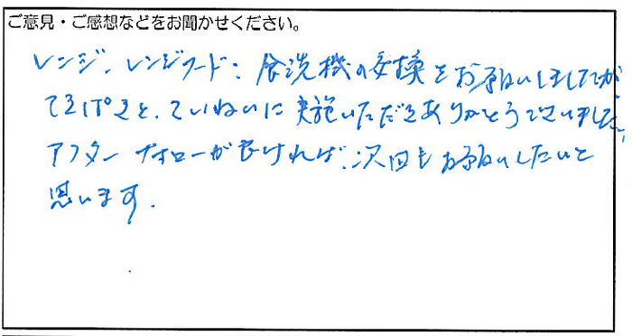 2024.01.19 お客様の声 茨木市 匿名様 レンジ、レンジフード、食洗機の交換をお願いしましたが てきぱきと、ていねいに実施いただきありがとうございました。 アフターフォローが良ければ、次回もお願いしたいと 思います。 お客様へ この度は弊社にご依頼いただき、誠にありがとうございます。 これからもご満足いただけるサービスを ご提供できるよう努めてまいります。 ご検討の設備がございましたら またお気軽ご連絡ください。