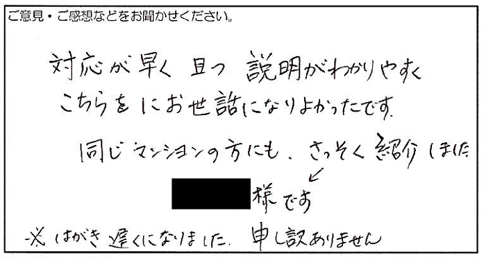 2024.01.19 お客様の声 茨木市 匿名様 対応が早く且つ説明がわかりやすく こちらにお世話になりよかったです。 同じマンションの方にも、さっそく紹介しました。 お客様へ この度は弊社にご依頼いただき、誠にありがとうございます。 弊社をご紹介いただき、大変うれしい限りです。 今後とも、何卒よろしくお願いいたします。