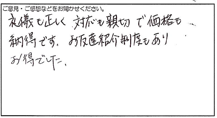 2024.01.21 お客様の声 神戸市 匿名様 礼儀も正しく、対応も親切で価格も 納得です。お友達紹介制度もあり お得でした。 お客様へ この度は弊社にご依頼いただき、誠にありがとうございます。 ご満足いただけたようで、とても嬉しく思います。 今後も、よりよいサービスを お届けできるよう努めてまいります。