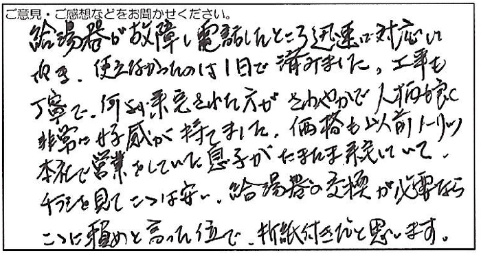 2024.01.21 お客様の声 宝塚市 匿名様 給湯器が故障し電話したところ迅速に対応して 頂き、使えなかったのは1日で済みました。工事も 丁寧で、何より来宅された方がさわやかで人柄も良く 非常に好感が持てました。価格も以前ノーリツ 本社で営業をしていた息子がたまたま来宅していて、 チラシを見てここは安い、給湯器の交換が必要なら ここに頼めと言った位で、折紙付きだと思います。 お客様へ この度は弊社にご依頼いただき、誠にありがとうございます。 嬉しいお言葉をいただき、大変恐縮でございます。 今後も、よりよいサービスを お届けできるよう努めてまいります。