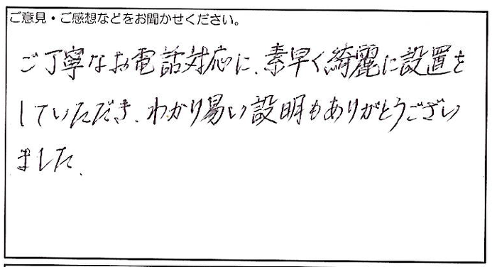 2024.01.21 お客様の声 神戸市 匿名様 ご丁寧なお電話対応に、素早く綺麗に設置を していただき、わかり易い説明もありがとうござい ました。 お客様へ この度は弊社にご依頼いただき、誠にありがとうございます。 嬉しいお言葉をいただき、大変恐縮でございます。 お客様からのご評価は、私たちにとって大変励みとなります。