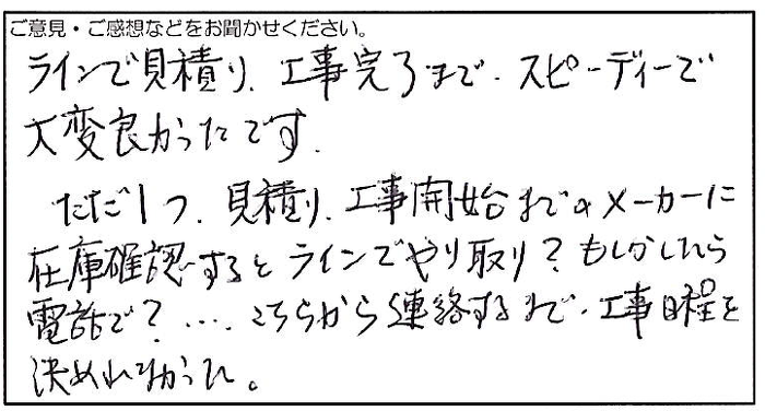 2024.01.23 お客様の声 明石市 匿名様 ラインで見積り、工事完了まで、スピーディで 大変良かったです。 ただ1つ、見積り、工事開始までのメーカーに 在庫確認するとラインでやり取り?もしかしたら 電話で?...こちらから連絡するまで、工事日程を 決めれなかった。 お客様へ この度は弊社にご依頼いただき、誠にありがとうございます。 納期の件で行き違いがありましたようで申し訳ございません。 お客様のご意見を参考に、より良いサービスを提供できるよう努めてまいります。