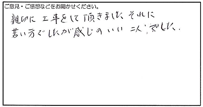 2024.01.23 お客様の声 神戸市 匿名様 親切に工事をして頂きました。それに 若い方でしたが感じのいい二人でした。 お客様へ この度は弊社にご依頼いただき、誠にありがとうございます。 お客様からのご感想をいただけて、 私たちもとても嬉しく思います。 今後とも、よろしくお願い申し上げます。